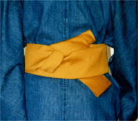 テ先を半分に折り、テ先から25cm位のところを前中心にあてます。